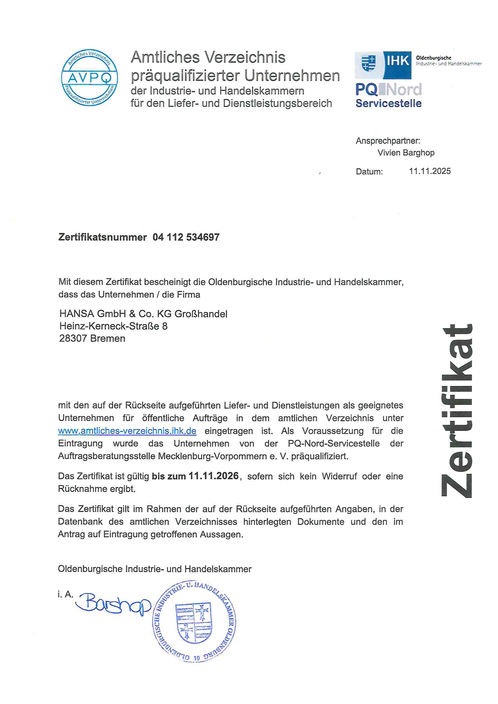 Mico und Hansa sind erneut mit dem PQV-Zertifikat ausgezeichnet worden.