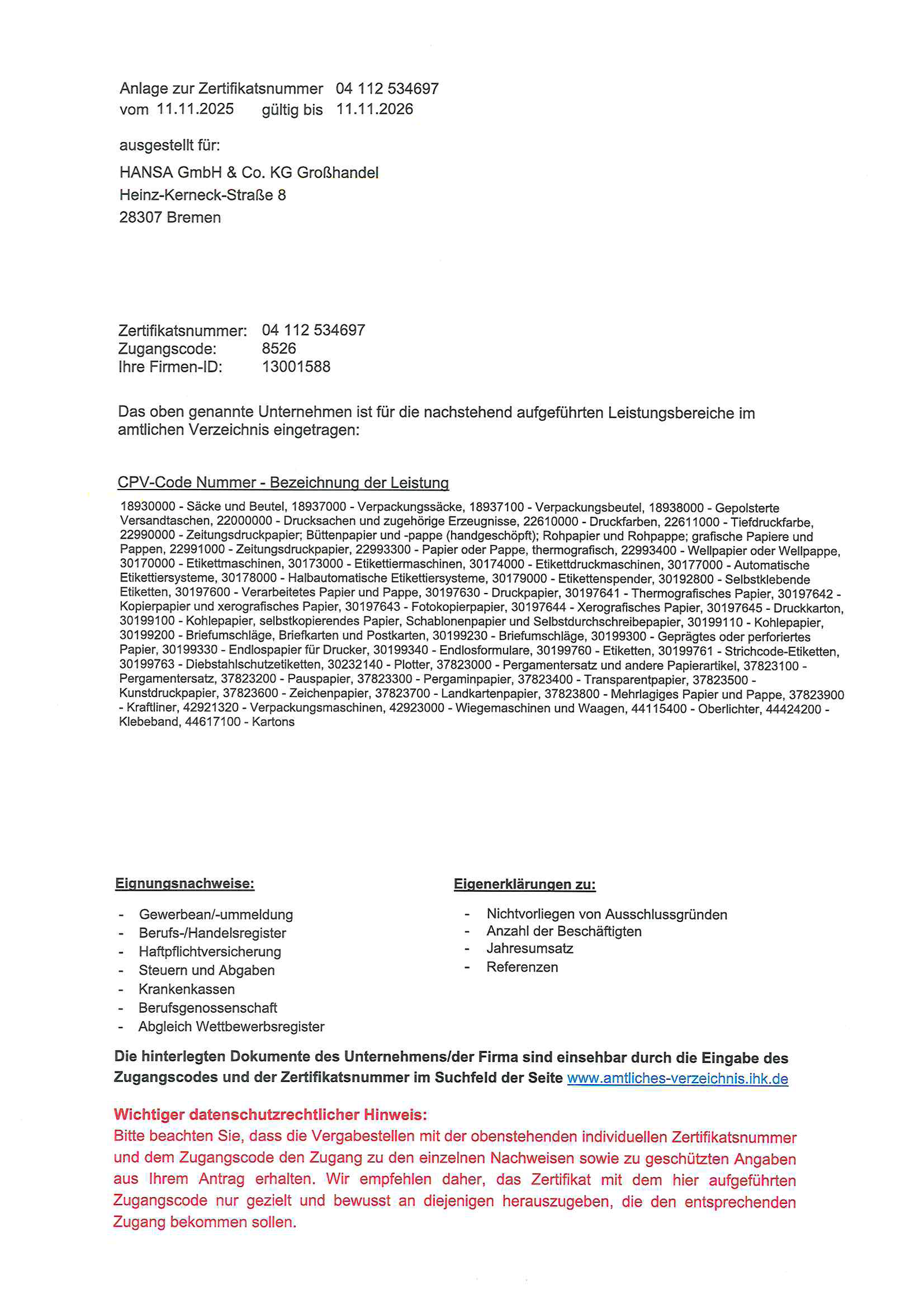 Insbesondere bei öffentlichen Ausschreibungen ist das Zertifikat eine wichtige Grundlage für die Teilnahme.