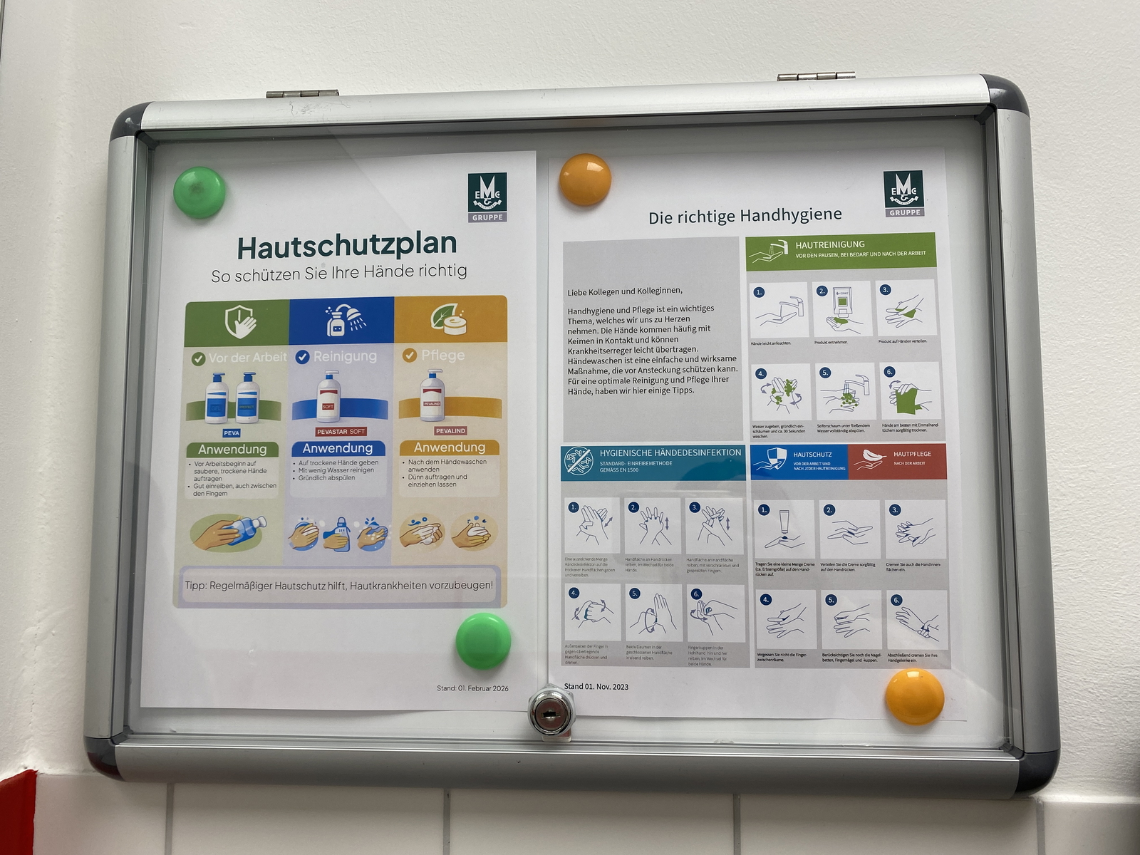 Ergänzend zu den bereitgestellten Produkten sind in allen Waschräumen Hautschutzpläne ausgehängt. Diese veranschaulichen übersichtlich, wann welches Produkt anzuwenden ist und wie die einzelnen Schritte korrekt durchgeführt werden. Die Hautschutzpläne dienen als praktische Orientierungshilfe im Arbeitsalltag und unterstützen eine einheitliche sowie sachgerechte Nutzung der Produkte.